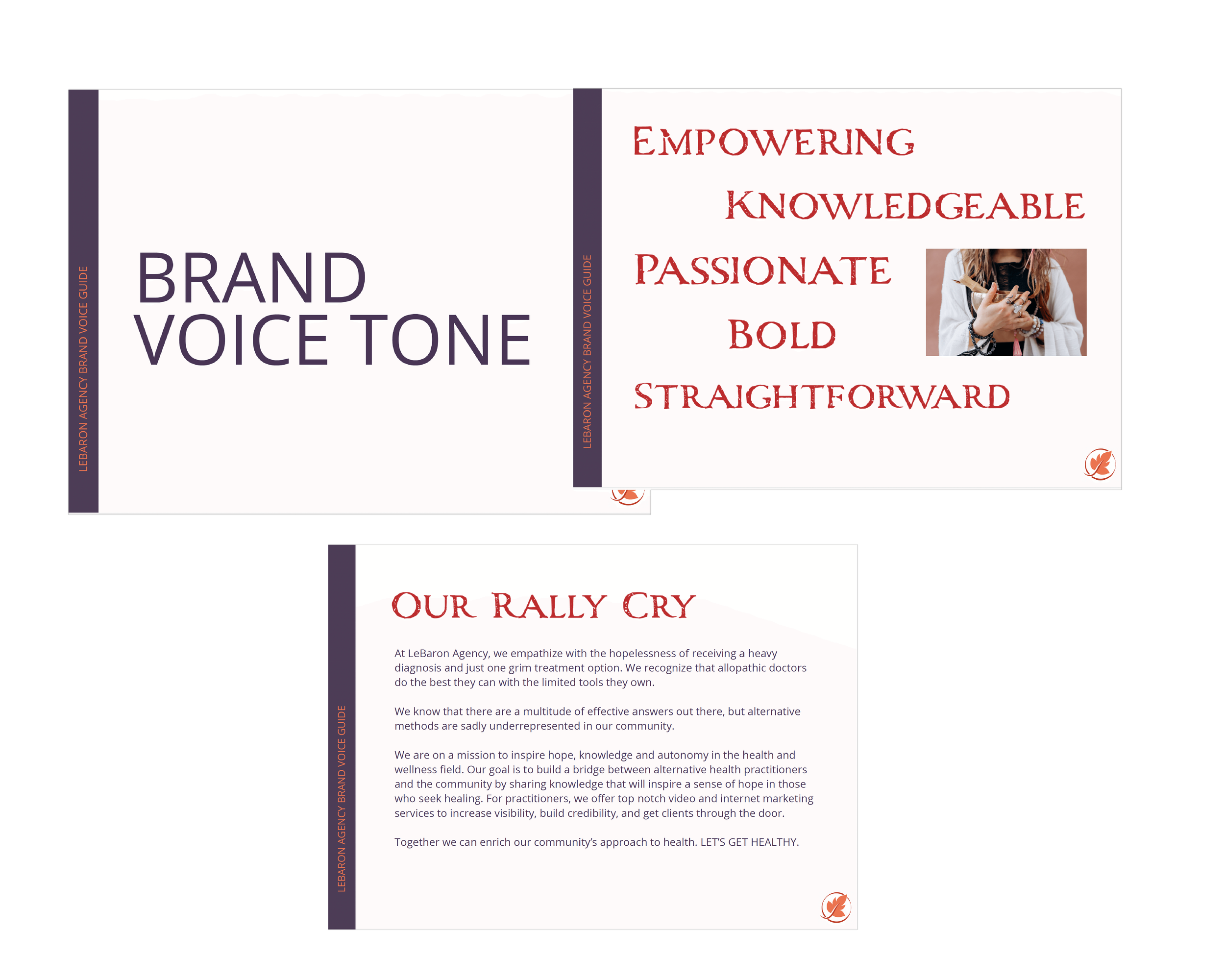 By the end of the process, my client had a book in her possession that strategically defined the brand’s purpose, mission, tone of voice, and phraseology. Plus had a few key business statemtns written, including the mission and vision statements, the rally cry, and the brand origination story.