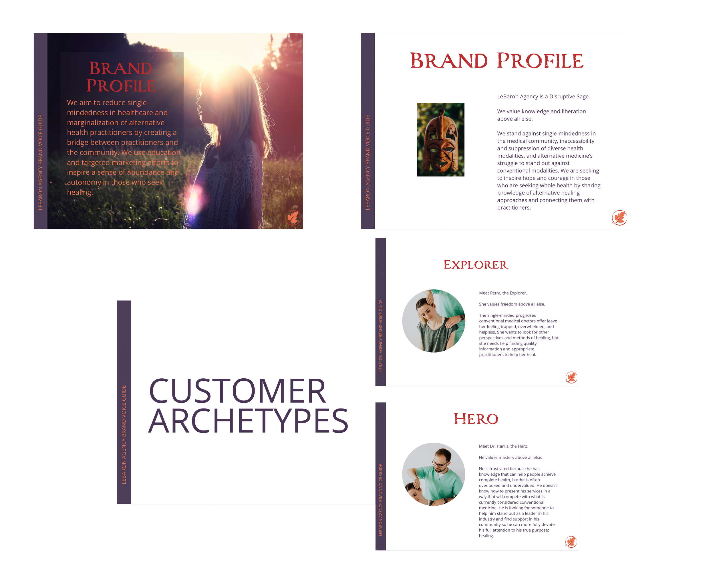 LeBaron had a couple of target clients because it contained multiple branches- one servicing holistic health practitioners and one servicing potential patients. So we established the most fitting archetype for each audience.