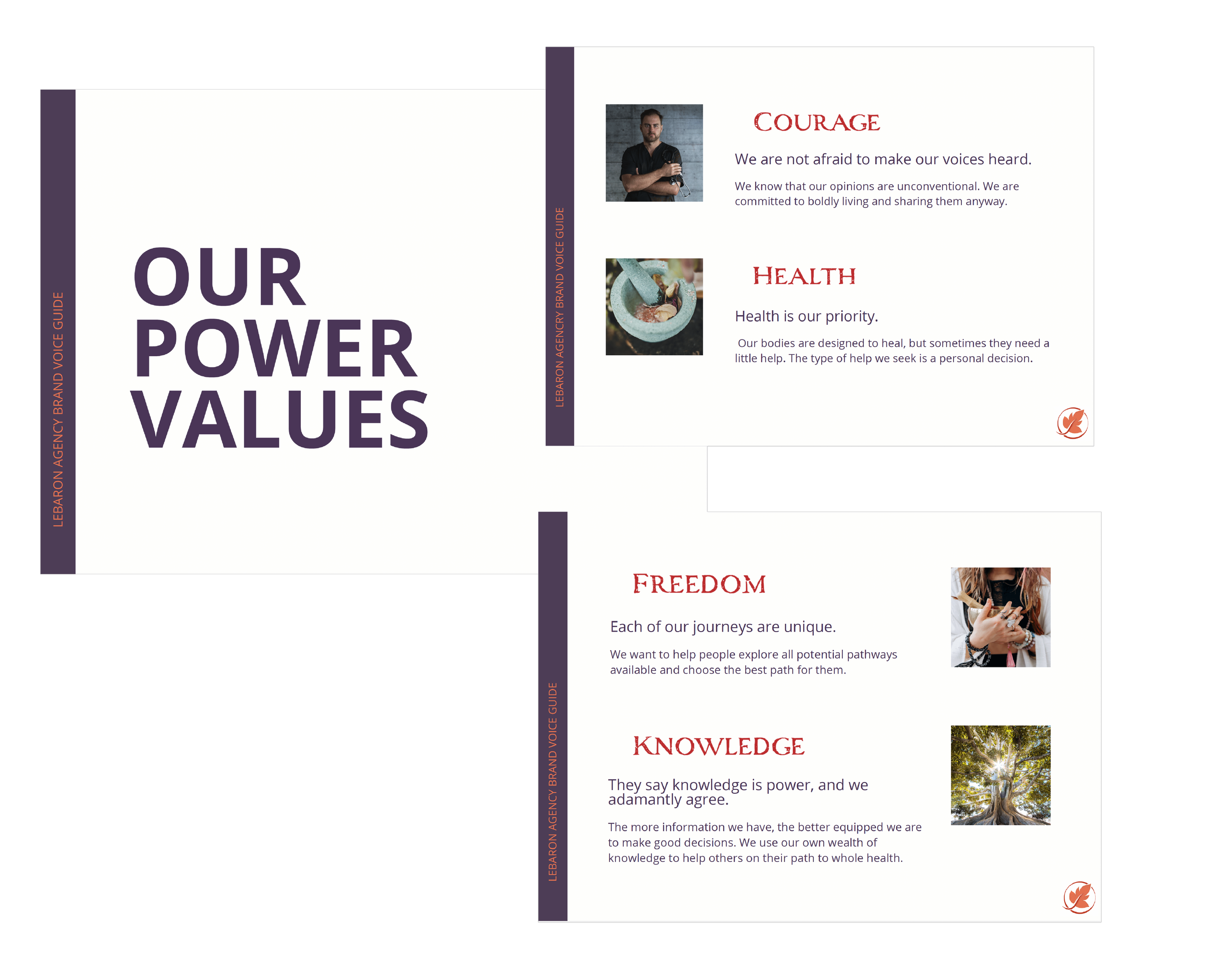 For the brand voice guide, we started with nailing down the values for the brand and then fleshing that out into conviction codes. This helps establish a solid narrative for all brand communications, internal and client facing. Having a strong foundation allows all of the following steps to fall into place more easily.